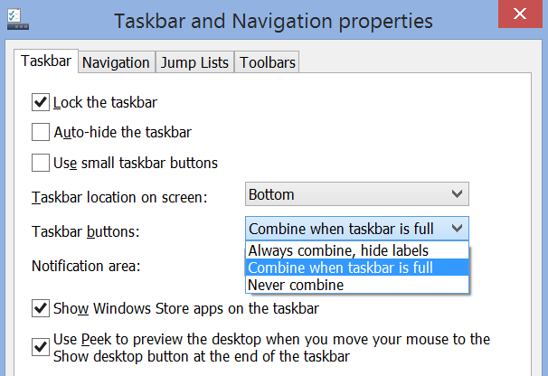 - Select “Taskbar Buttons:” drop down, select “Always combine, hide labels”